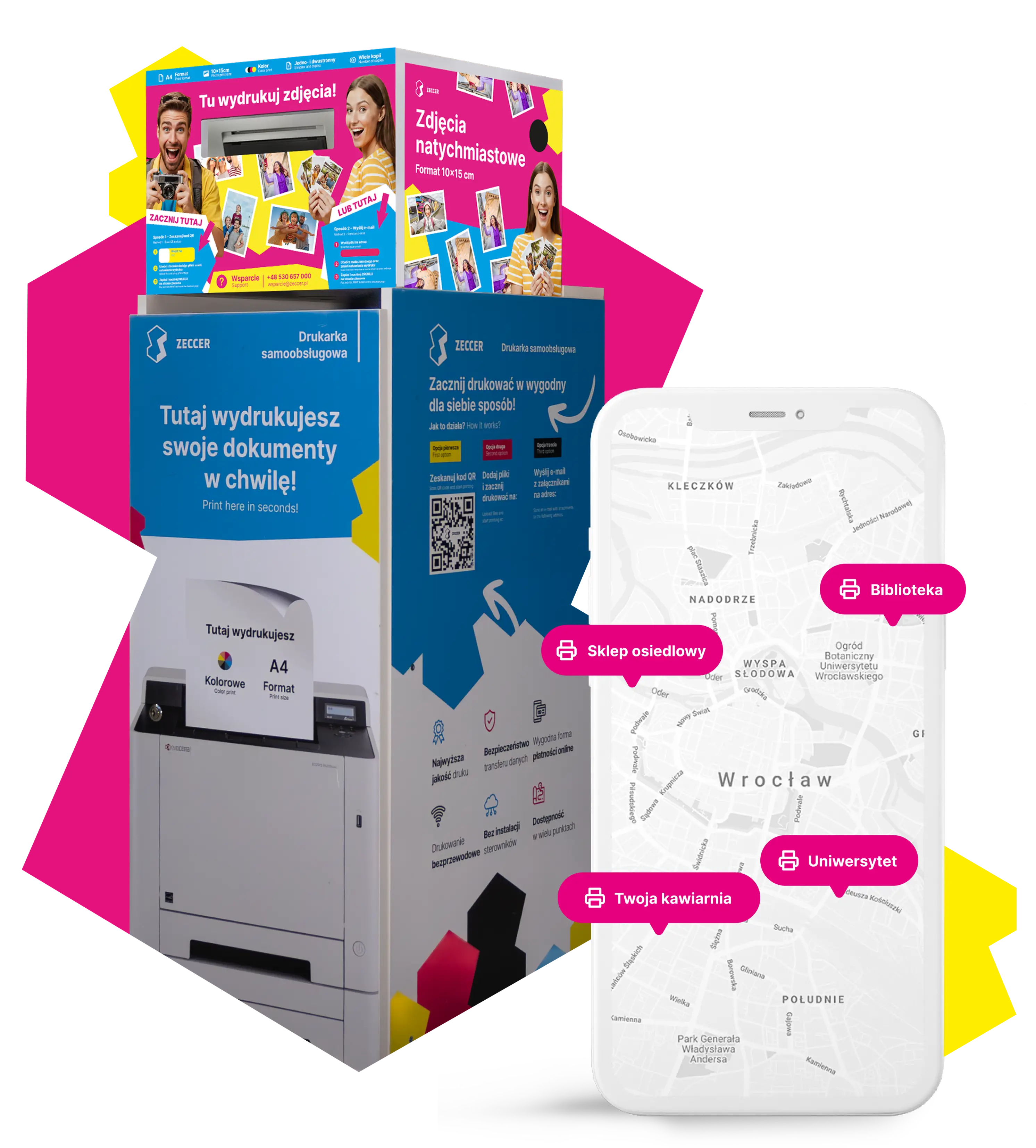 Zeccer to sieć samoobsługowych stacji druku A4 i Foto w Twoim mieście oraz drukarnia online z wygodną dostawą do paczkomatu. Drukuj szybko, łatwo i tam, gdzie Ci najbliżej.